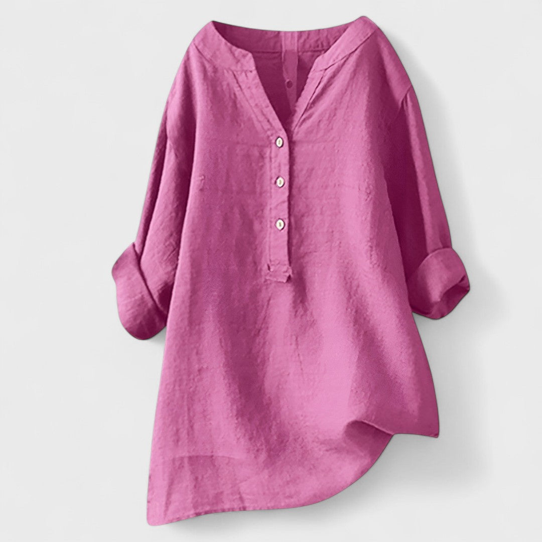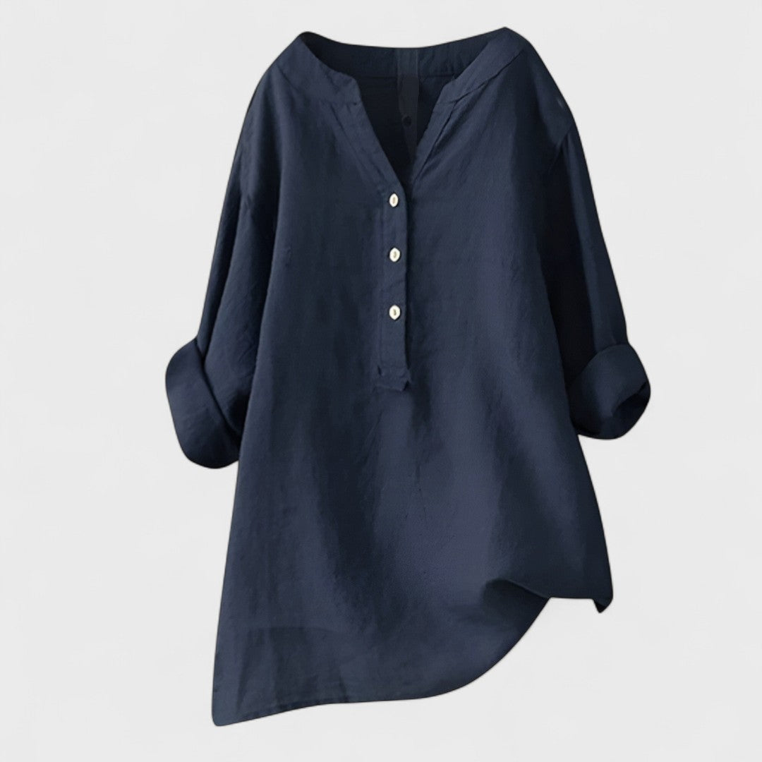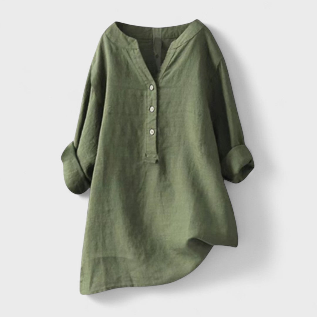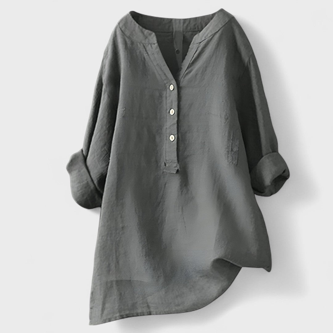 Srajca Freja je nepogrešljiv kos za dni, ko želite izgledati urejeno, a se hkrati počutiti svobodno. Narejena je iz lahkega, zračnega materiala, ki vam omogoča dihanje tudi v vročem vremenu. Klasično gumbno zapiranje in diskreten ovratnik dodajata brezčasni videz, medtem ko ohlapen kroj z rahlo podaljšano dolžino laskata postavi in zagotavljata odlično podlago za plastenje.