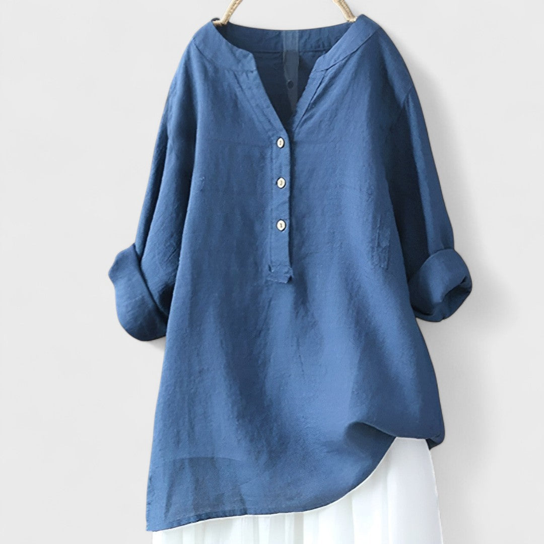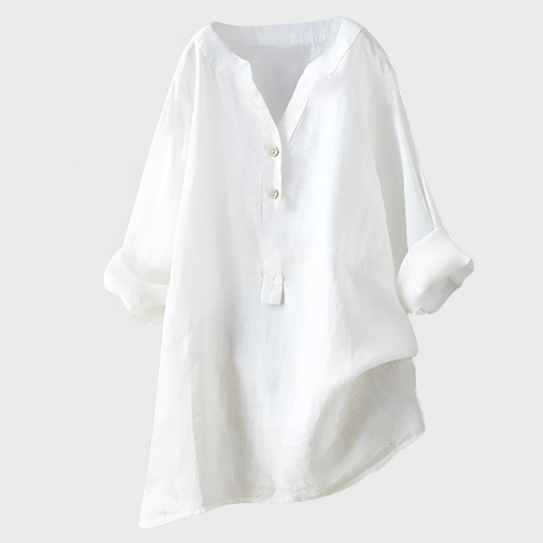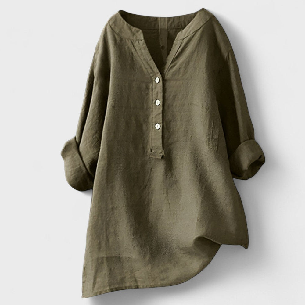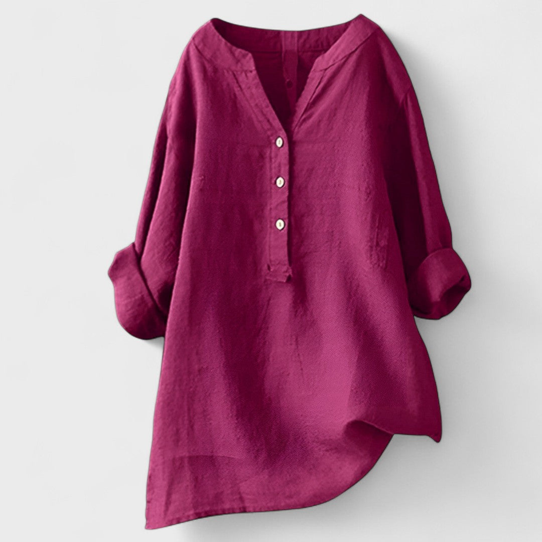 Srajca Freja je nepogrešljiv kos za dni, ko želite izgledati urejeno, a se hkrati počutiti svobodno. Narejena je iz lahkega, zračnega materiala, ki vam omogoča dihanje tudi v vročem vremenu. Klasično gumbno zapiranje in diskreten ovratnik dodajata brezčasni videz, medtem ko ohlapen kroj z rahlo podaljšano dolžino laskata postavi in zagotavljata odlično podlago za plastenje.