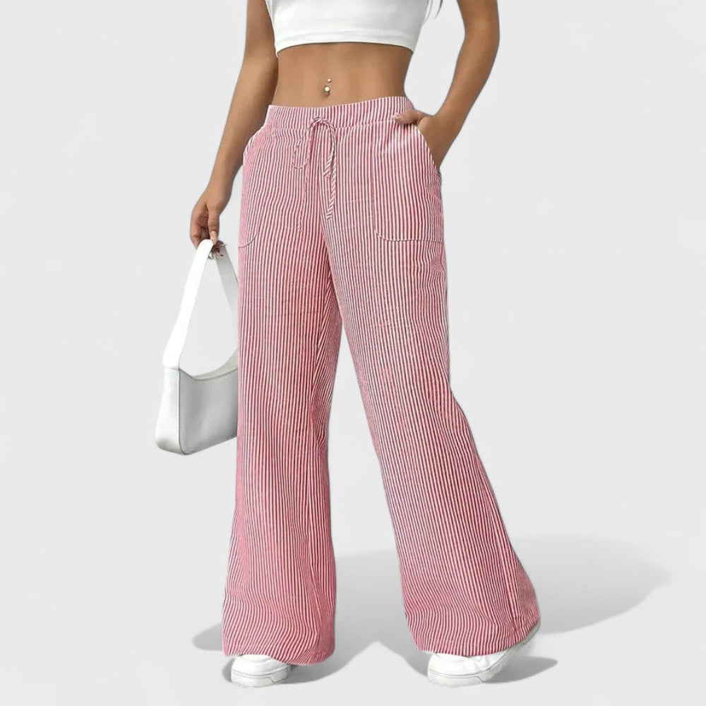 Hlače Dominique so popolna kombinacija sodobnega kroja in brezčasne elegance. Njihove široke, proste nogavice in visok pas z diskretnimi gubami ter pasom ustvarjajo žensko silhueto, ki je ne le stilna, ampak tudi neverjetno udobna. So šivane iz lahkega, zračnega materiala, kar jih dela idealno izbiro za vsako priložnost – od pisarne do večernega druženja.