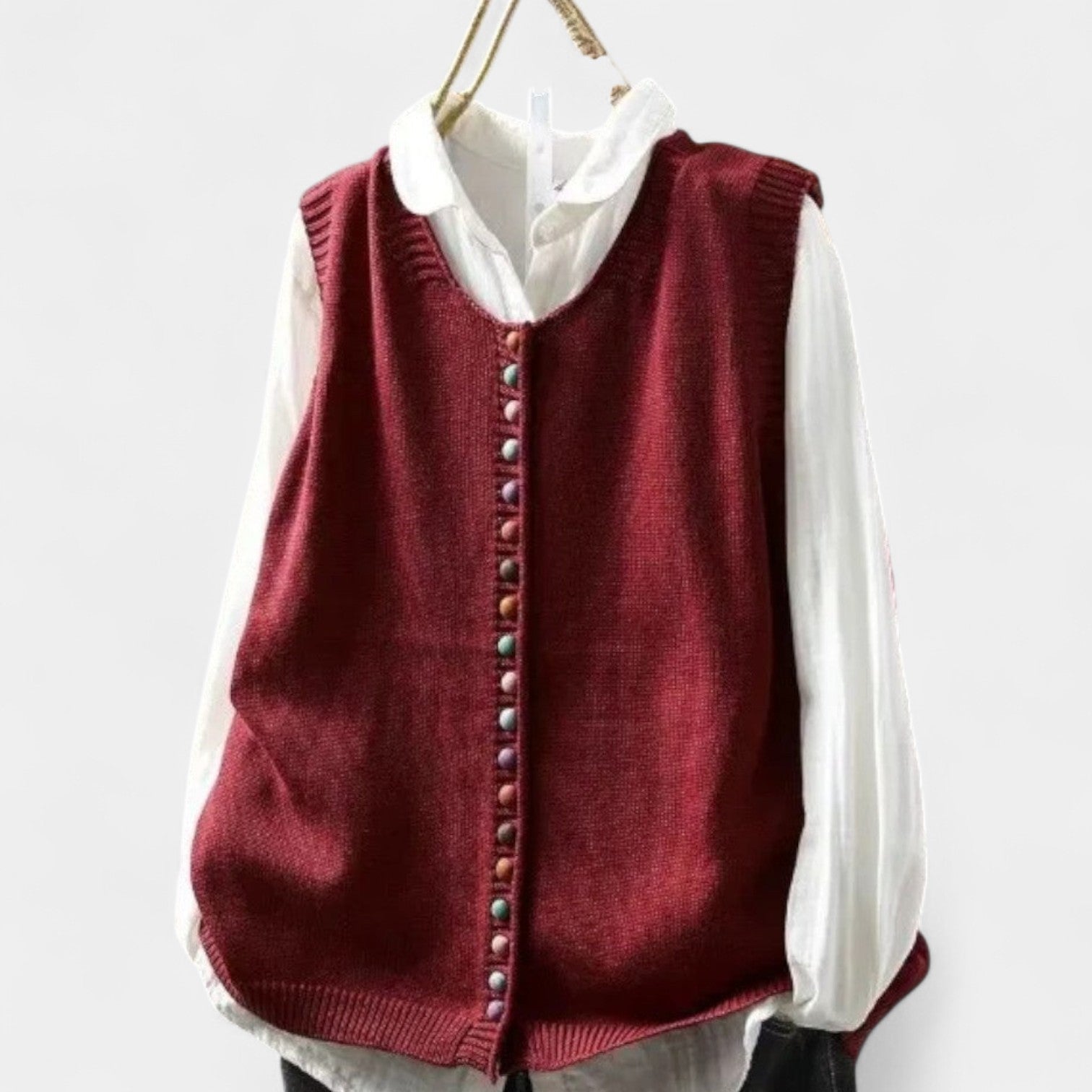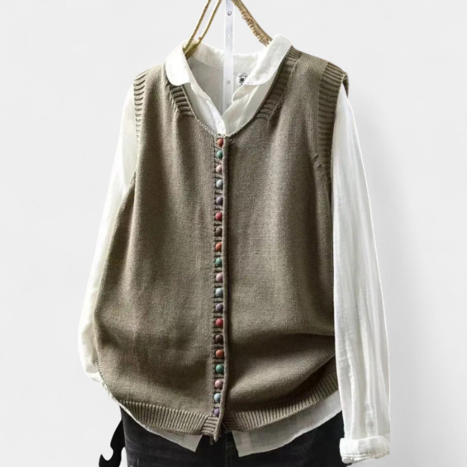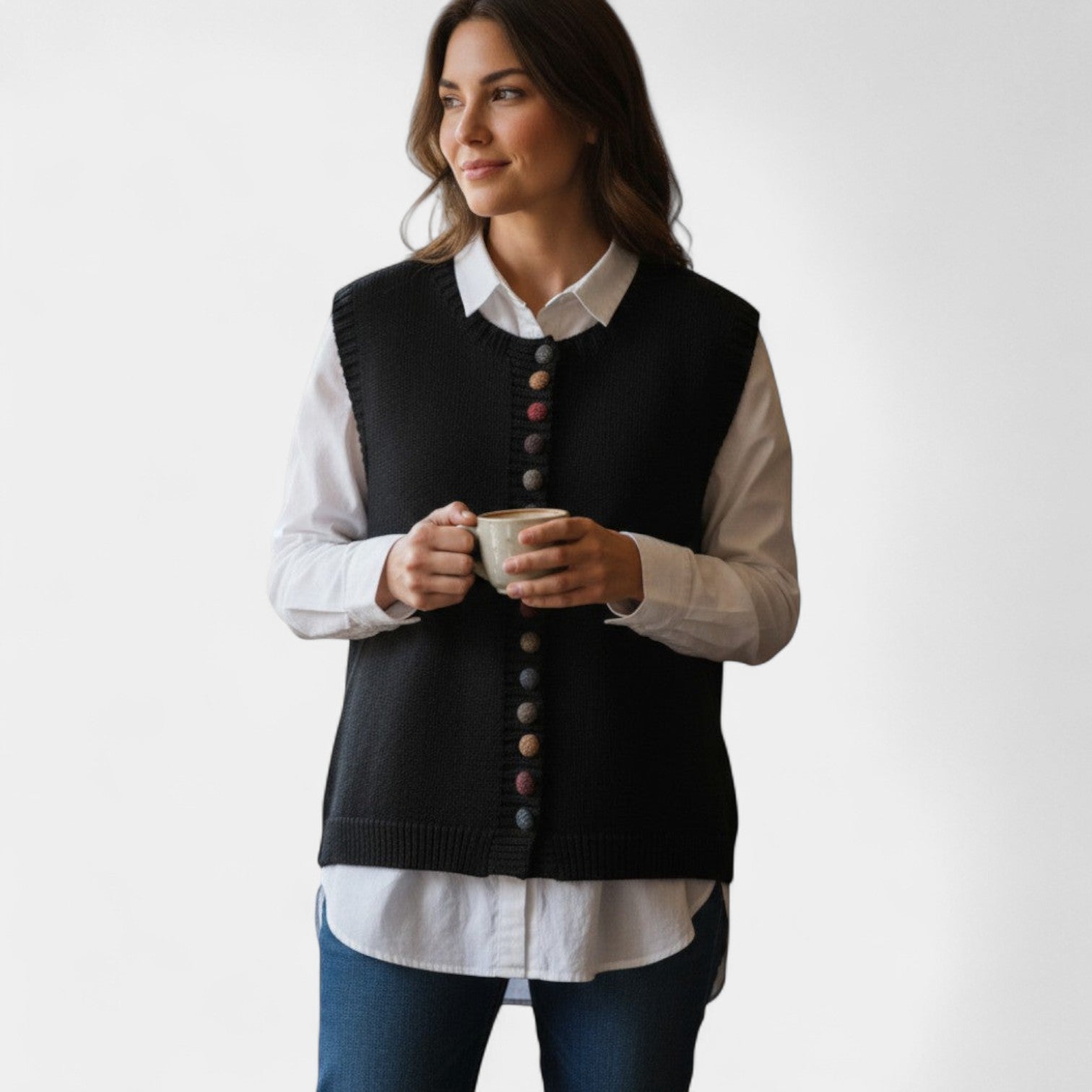 Pleteni telovnik Karmen je popolna povezava udobja in elegance. Njegov brezčasen dizajn in vsestranski kroj ga naredita nepogrešljiv kos vaše garderobe – idealen za plastenje čez srajco, obleko ali majico. Odlično se poda tako za delo kot za prosti čas ali večerne priložnosti.