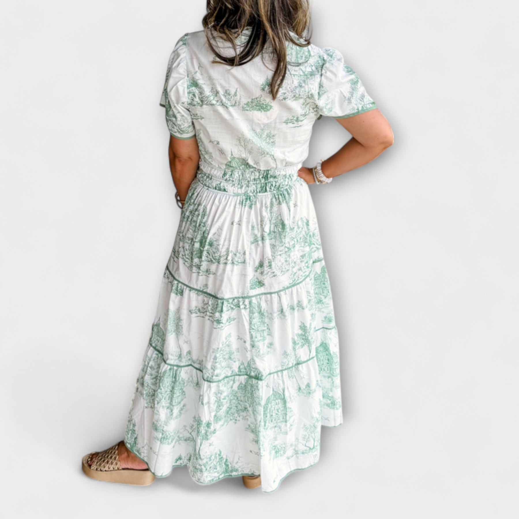 Predstavljamo Elizo | Klasična maxi obleka s potiskom – Vaš popoln spremljevalec za pomladne dni in vrtne zabave! Ta brezčasni kos brez truda združuje eleganten videz z maksimalnim udobjem in ima osupljiv zeleni in bel potisk, ki izžareva klasični romantizem.